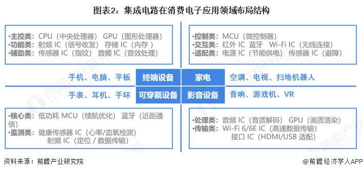 中国集成电路行业需求市场以消费电子芯片为主体,应用覆盖终端设备(手机、电脑、平板等)、智能家具(空调、电视、扫地等)、可穿戴设备(手表、耳机、手环等)及影音娱乐设备(音响、游戏机、VR等)四大细分市场,通过产业CPU、GPU、MCU、射频产业IC、存储产业IC、传感器产业IC产业等关键芯片,支撑设备运算、控制、连接、检测等多元场景应用,贯穿到消费者的日常生活中,需求规模庞大且市场前景广阔。