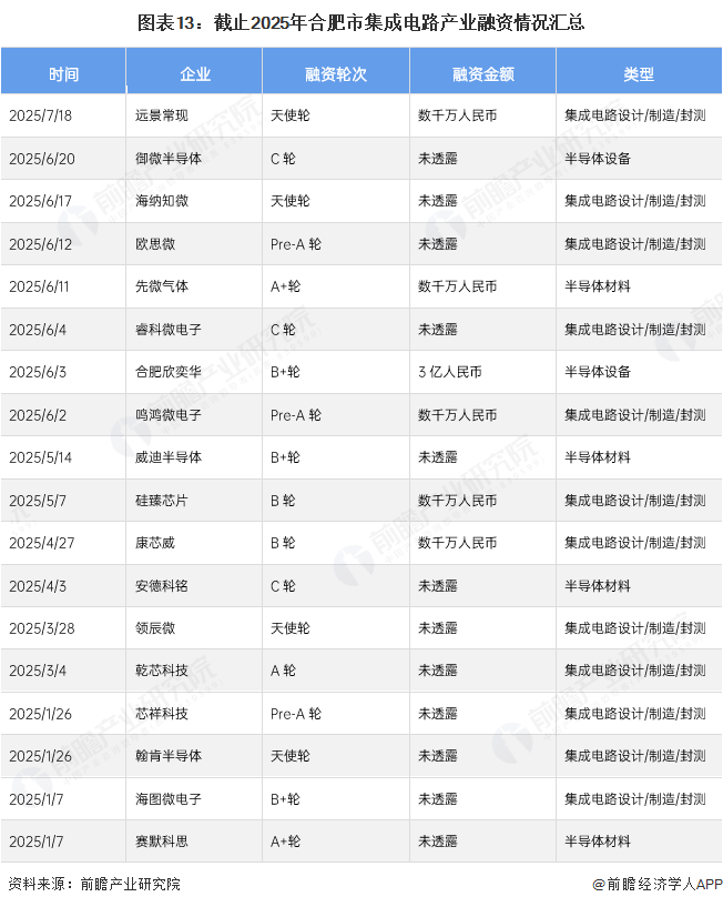 从集成电路产业融资情况来看,截止2025年,合肥市集成电路产业融资情况火热,无论是半导体器件/材料制造商还是集成电路设计/制造/封测企业,融资事件都较多。这表明合肥市集成电路产业链发展势态良好,企业较受资本青睐。