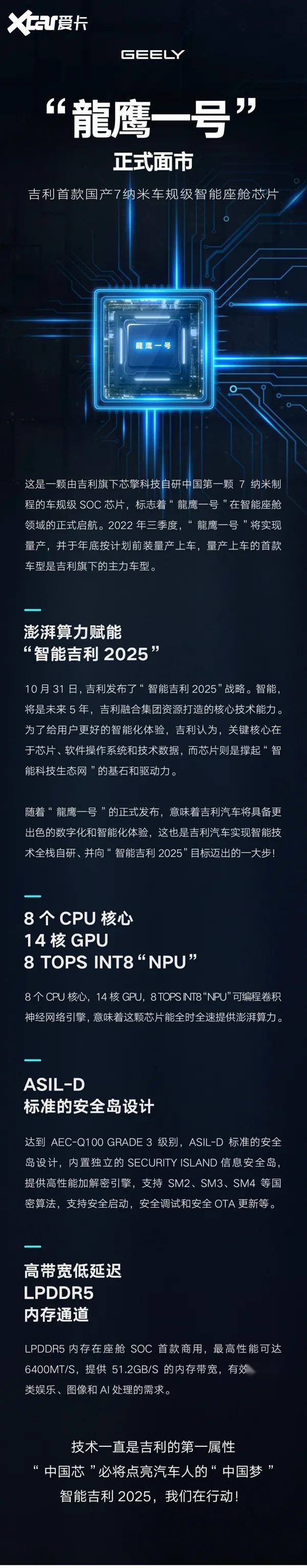 官方介绍这是一颗由旗下芯擎科技自研中国第一颗7纳米制程车规级SoC芯片,标志着“龍鹰一号”在智能座舱领域正式启航。“龍鹰一号”将于2022年三季度实现量产,并于年底按计划前装量产上车,量产上车的首款车型是吉利旗下的主力车型。